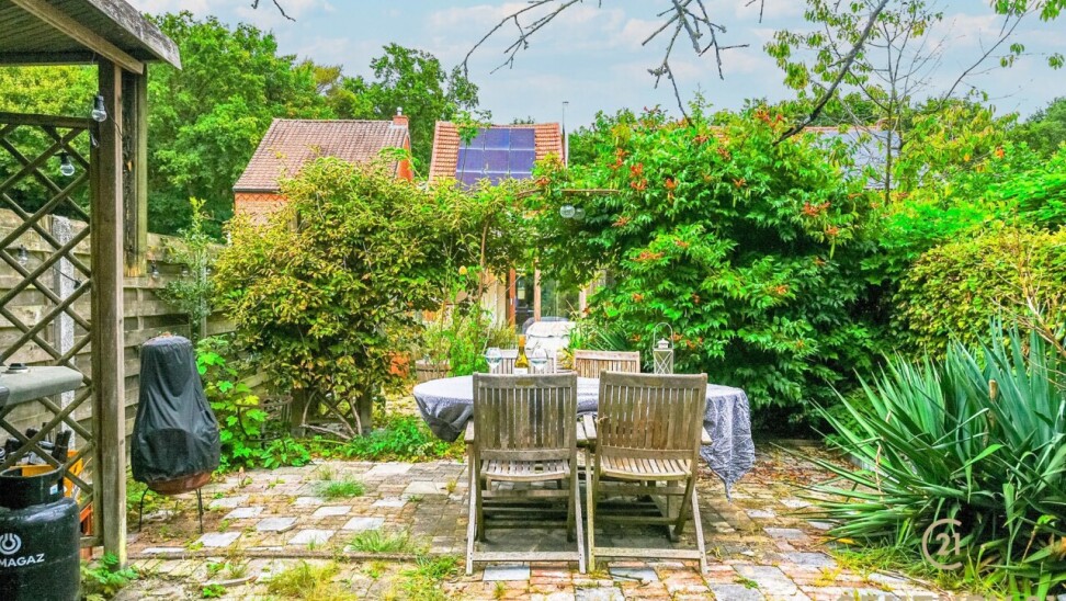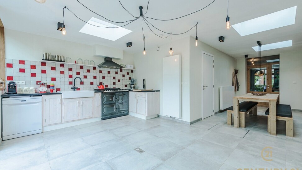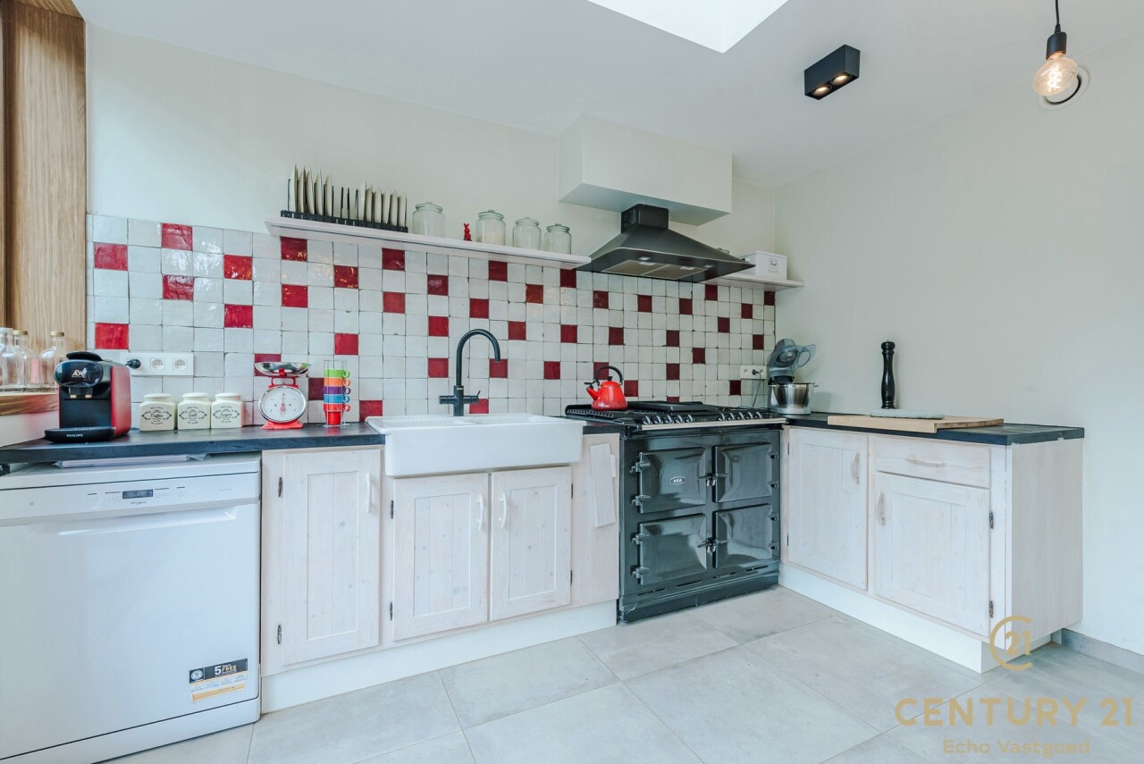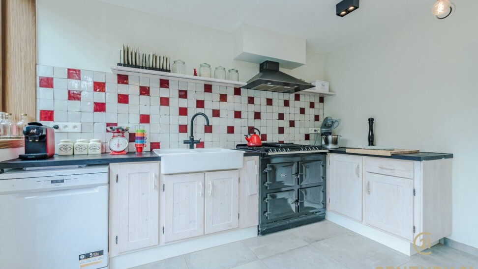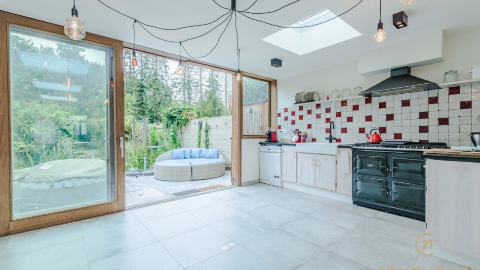 The kitchen is a true eye-catcher, with a stylish finish and an impressive AGA stove — the pinnacle of stoves for connoisseurs. From the kitchen, a large sliding door leads to the spacious garden, perfect for lively garden parties and equipped with practical storage spaces at the back. If you have a green thumb, this is the perfect place to create your own green paradise!