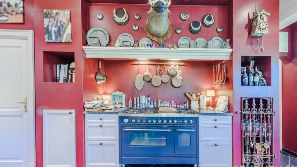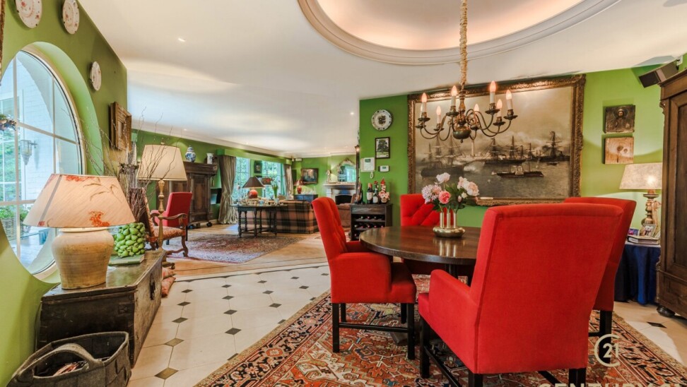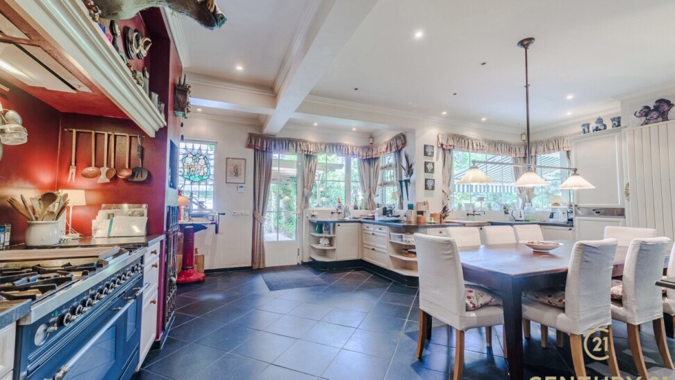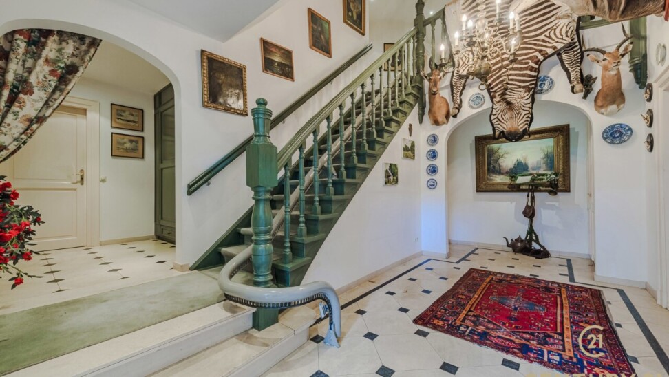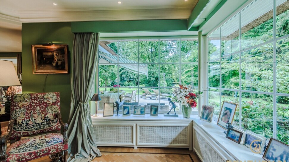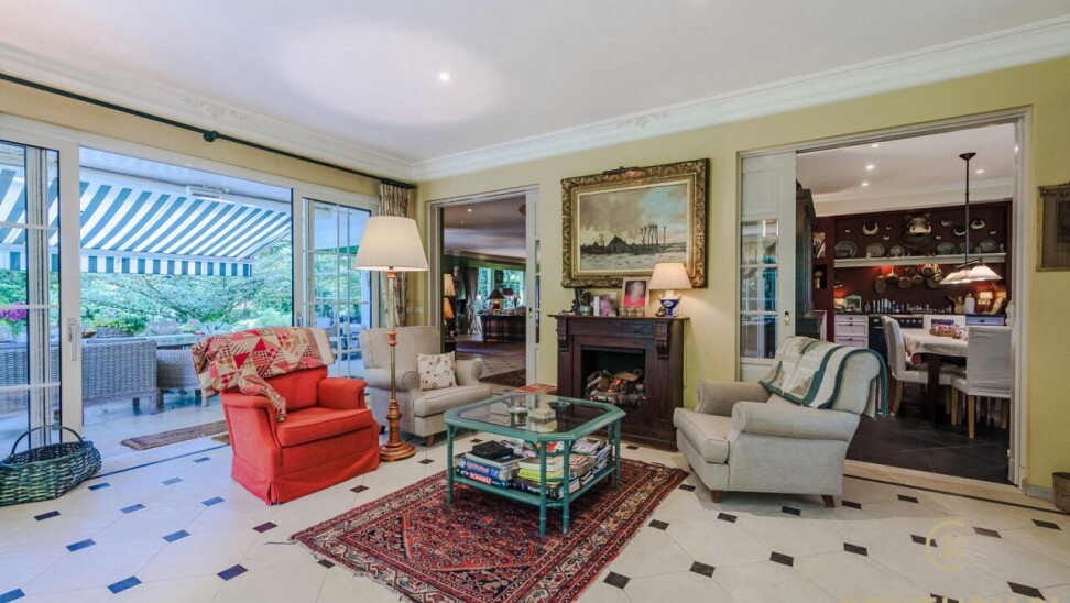Through the spacious entrance hall with guest toilet and separate office space you enter the cozy living space. The cozy fireplace, wide windows and the seamless transition to the dining room create a warm, homely atmosphere with views of the beautiful garden throughout. The fully equipped kitchen is pleasantly spacious and features a connecting storage room.