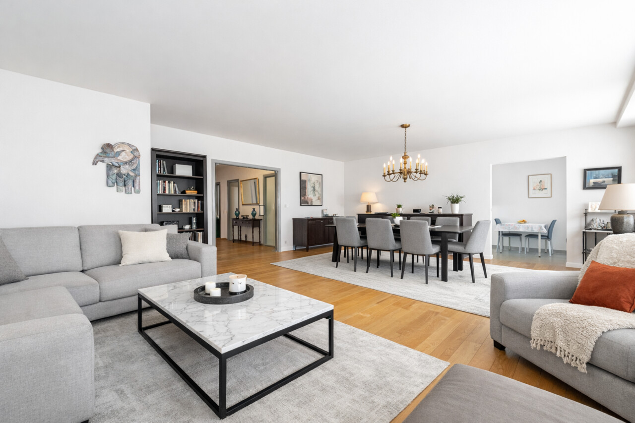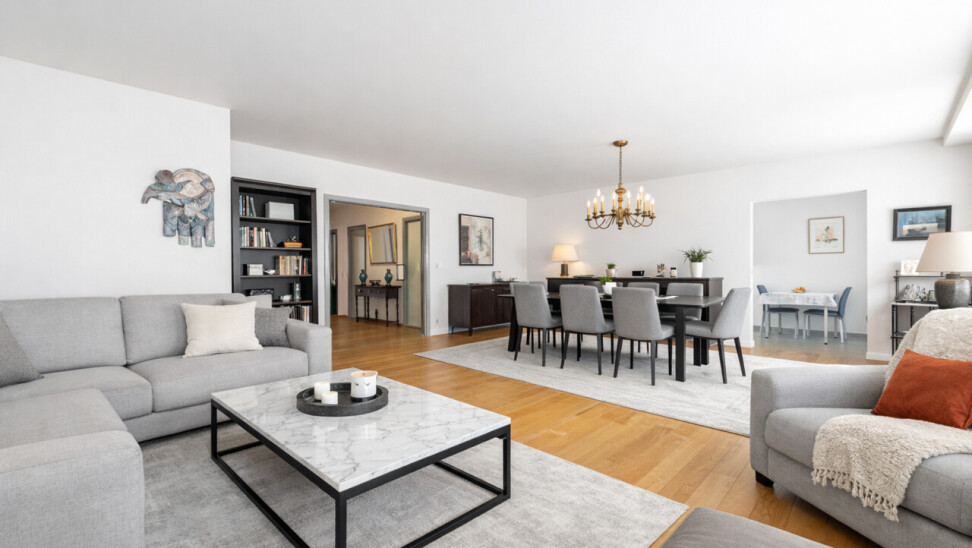 The stylish entrance hall, with built-in wardrobes and a separate guest toilet with hand basin, sets the tone. Elegant double doors lead into the impressive, light-filled living room, finished with beautiful solid oak parquet flooring that continues throughout the hallway—adding warmth and character.