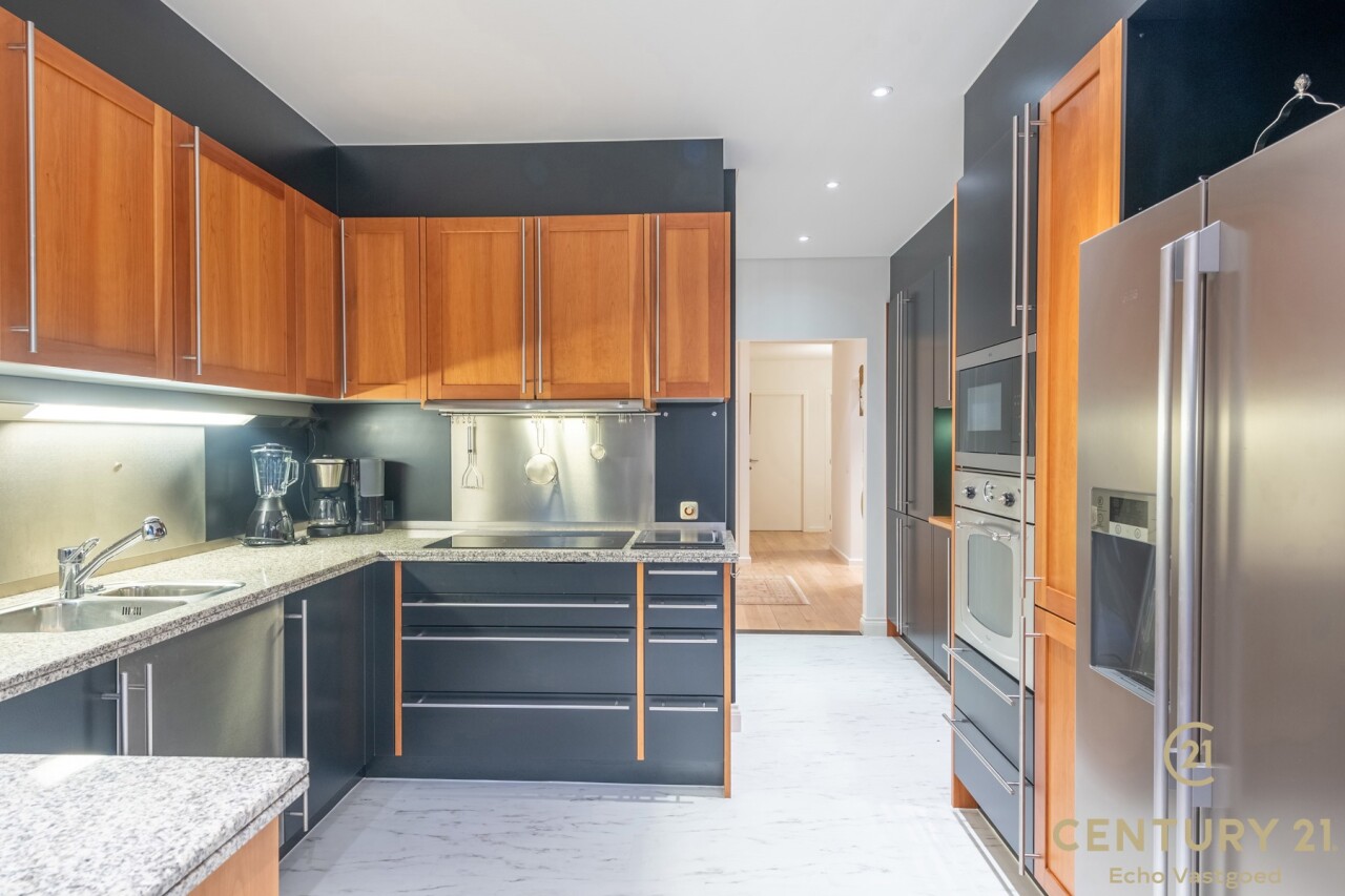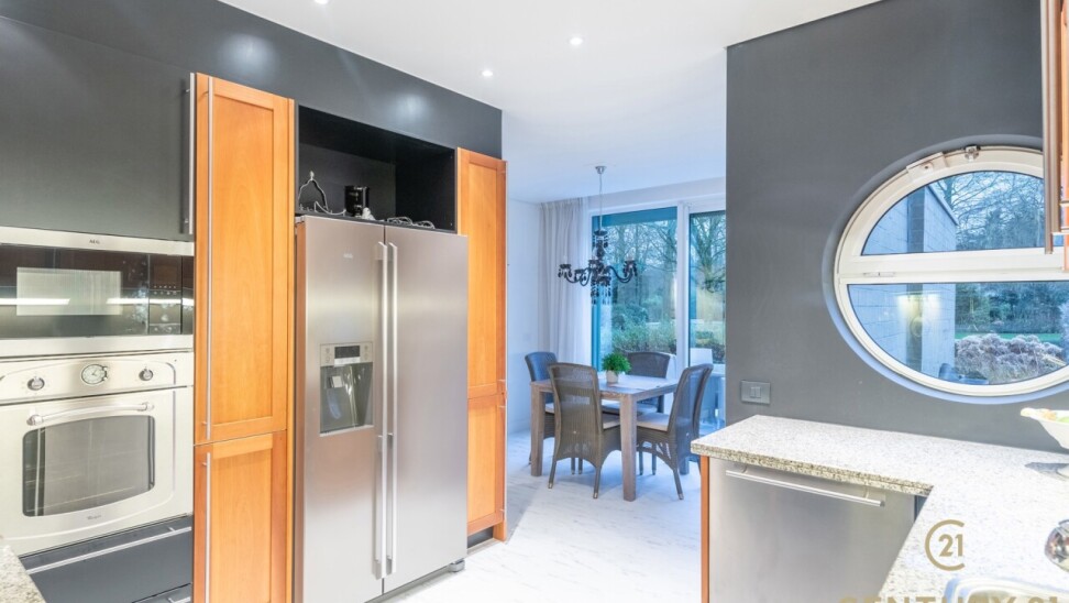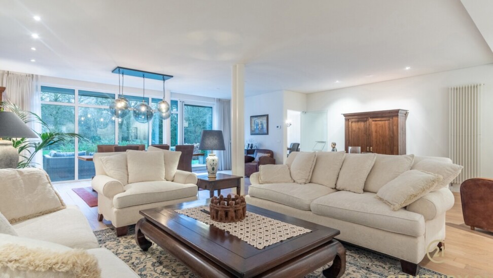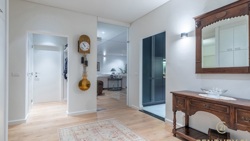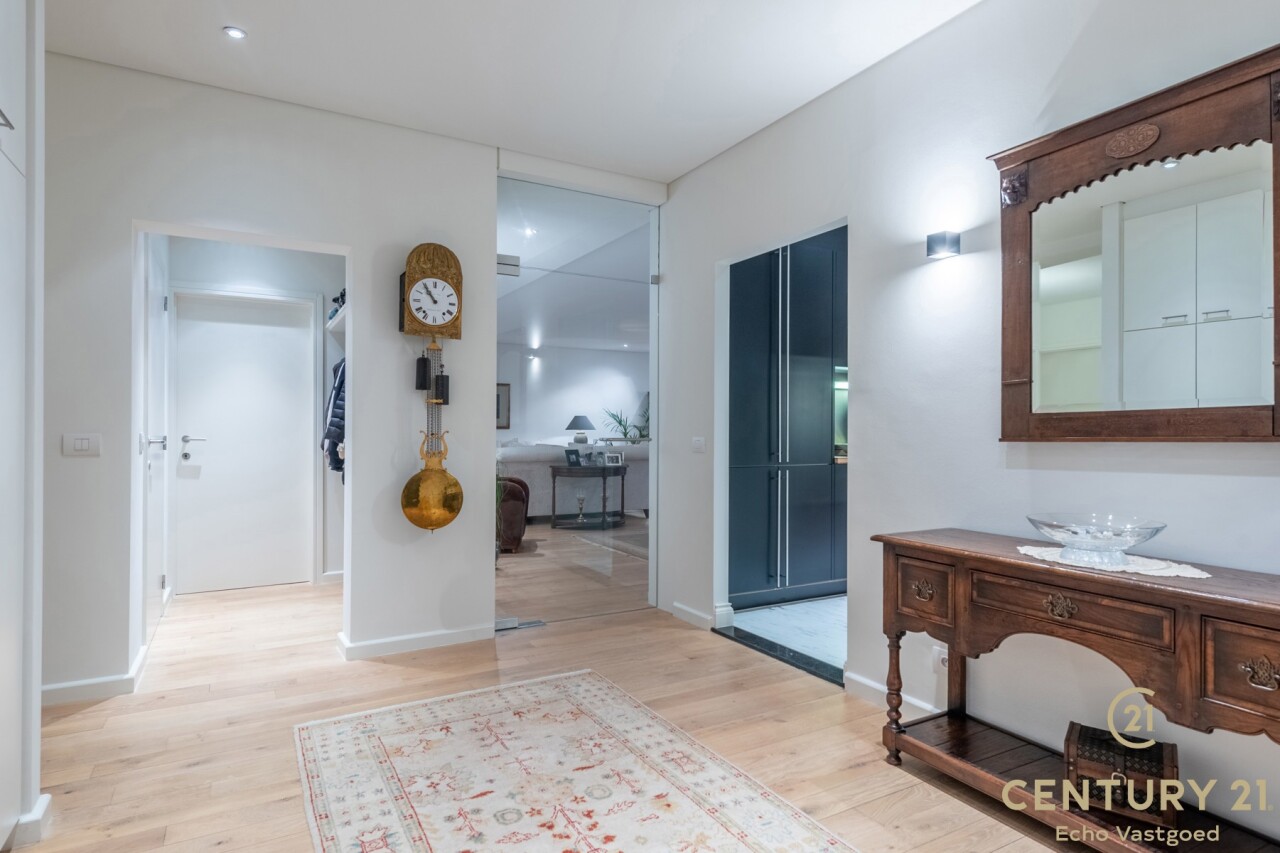 The apartment itself exudes luxury and comfort. You enter into a stylish entrance hall, which features a practical checkroom and a guest toilet. From the hall you enter the spacious and bright living room, which, thanks to large windows and sliding doors, offers a beautiful view of the park. The living room flows smoothly into the kitchen and dining room, where you can cook and dine in comfort.
