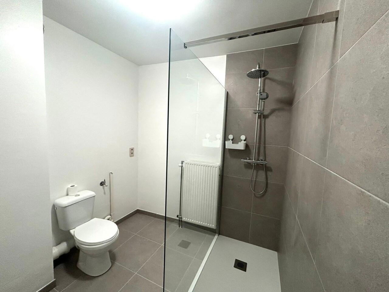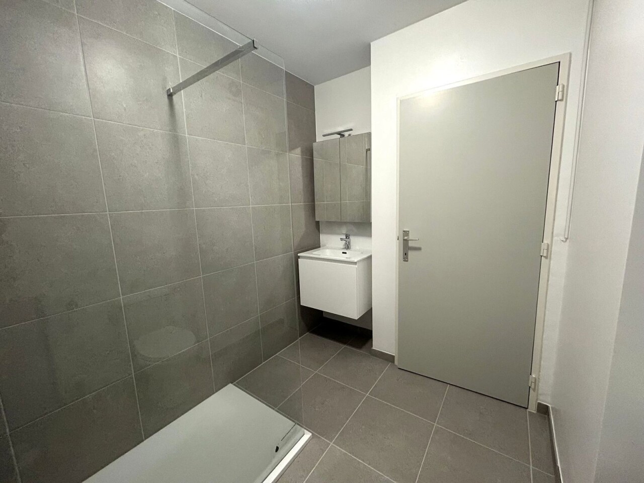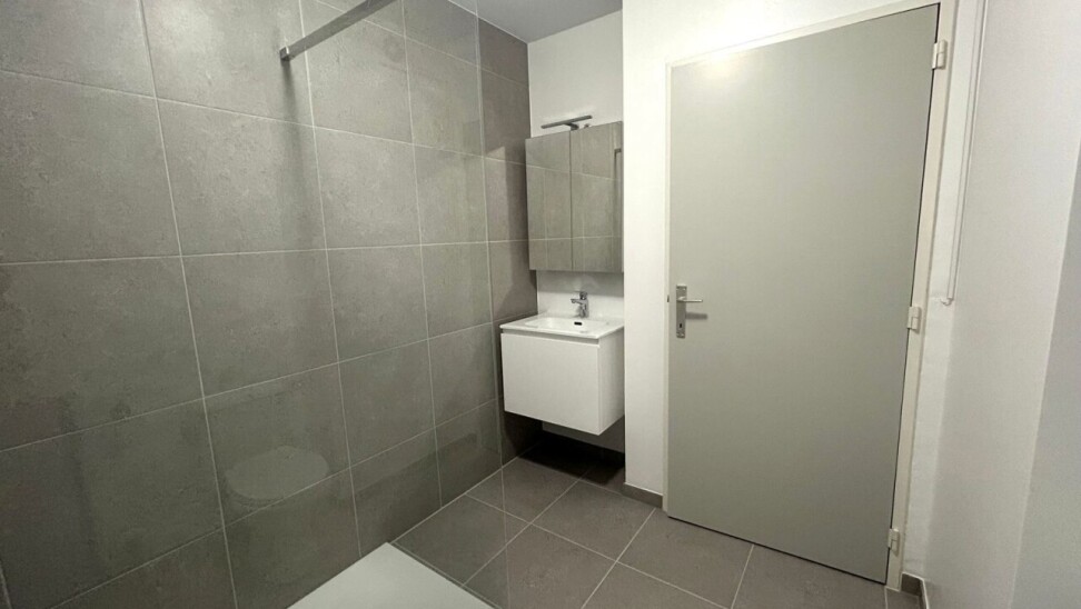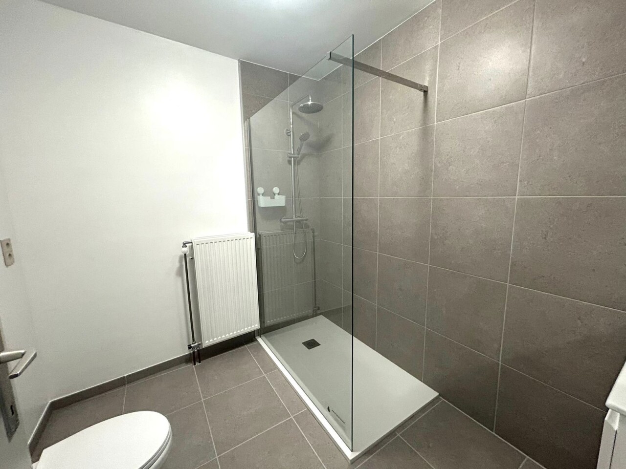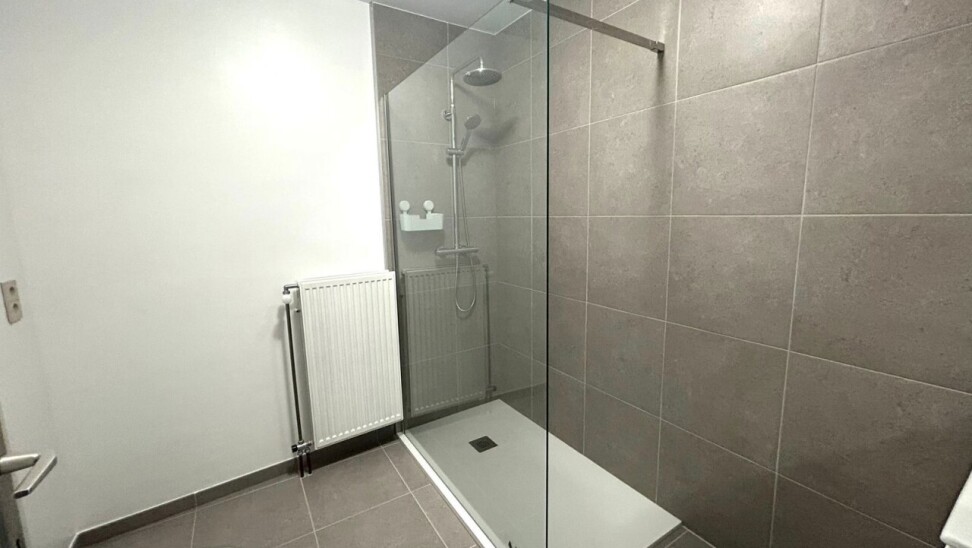 De ruime badkamer is modern ingericht en voorzien van een inloopdouche, wasmeubel, toilet en aansluiting voor de wasmachine.