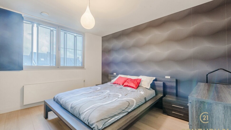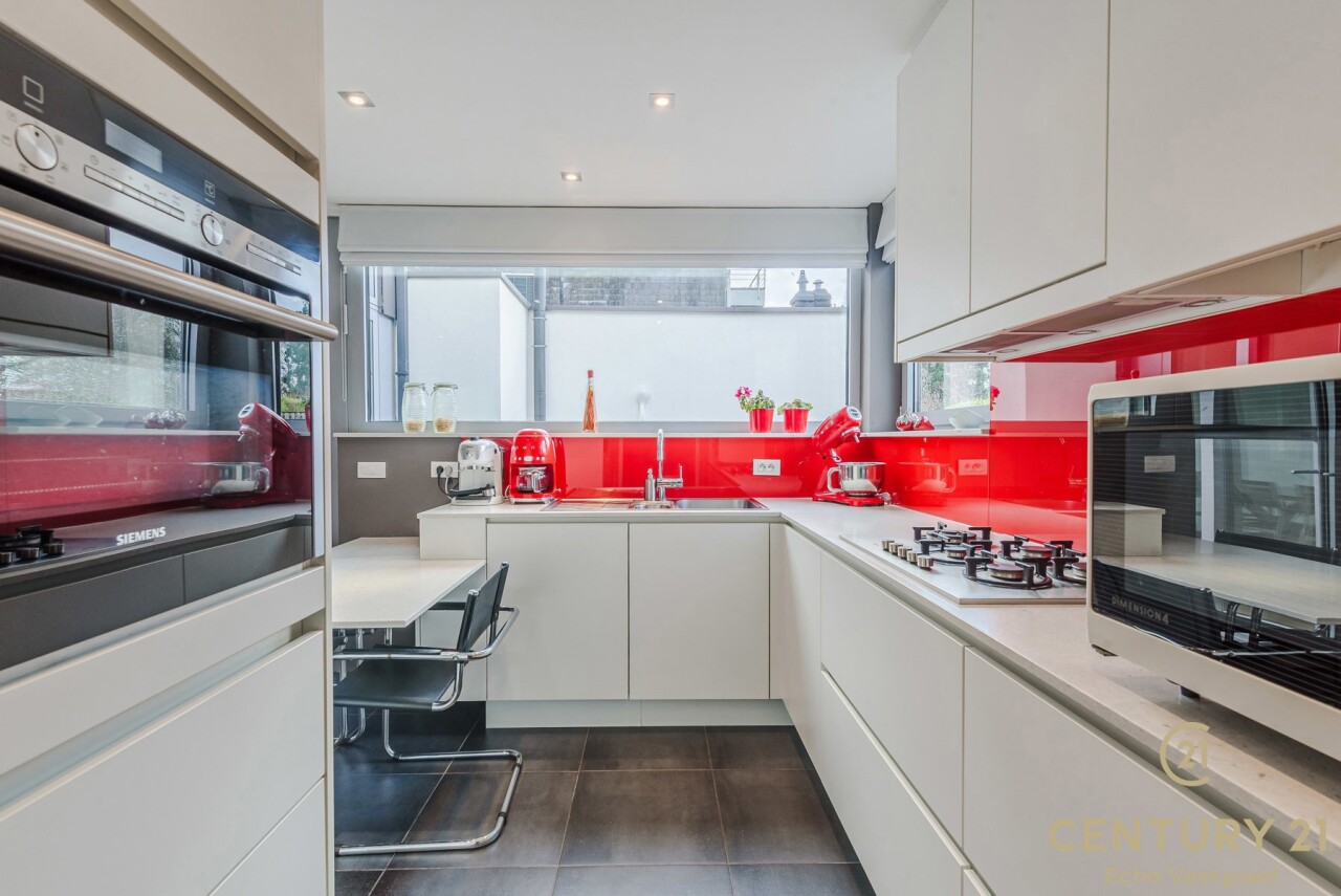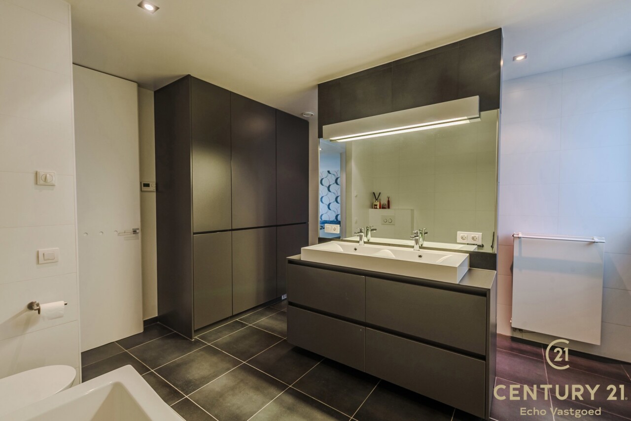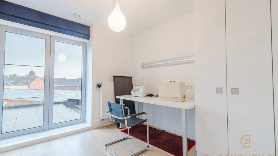 Op de verdieping bevindt zich de leefruimte met een gastentoilet, een moderne en perfect afgewerkte keuken met aansluitende berging en een ruime living met voldoende plaats voor een zithoek, eetruimte en bureau. Aansluitend geniet u van een aangenaam zonneterras.
