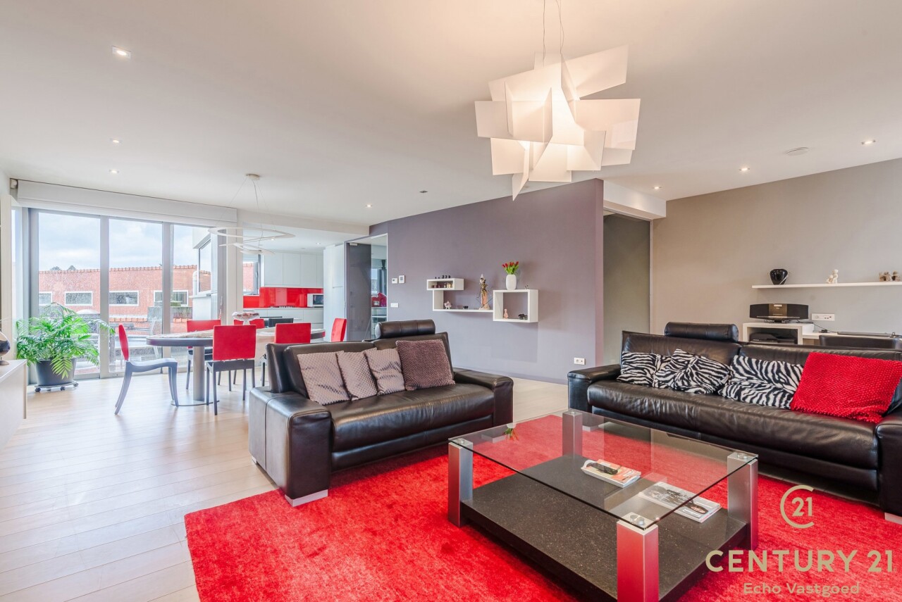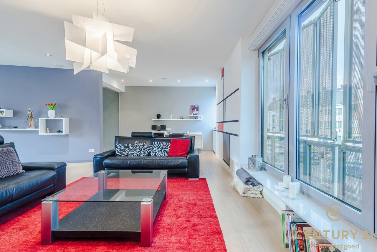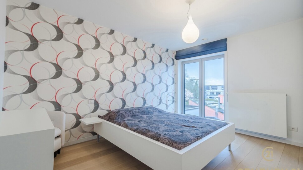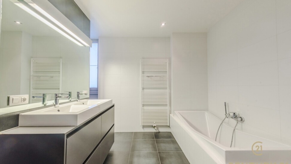 Op de verdieping bevindt zich de leefruimte met een gastentoilet, een moderne en perfect afgewerkte keuken met aansluitende berging en een ruime living met voldoende plaats voor een zithoek, eetruimte en bureau. Aansluitend geniet u van een aangenaam zonneterras.