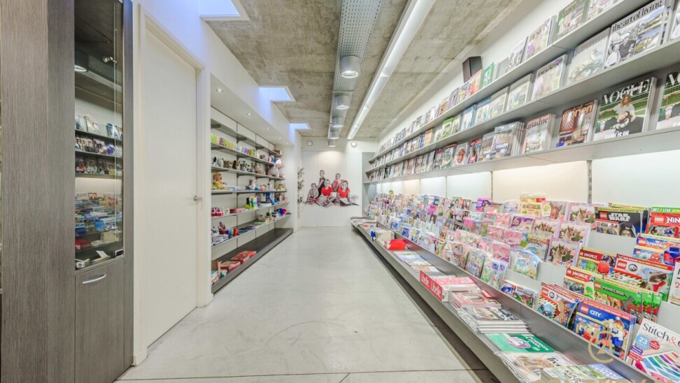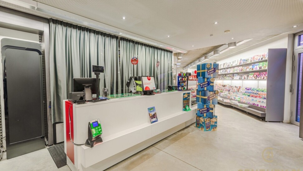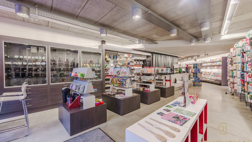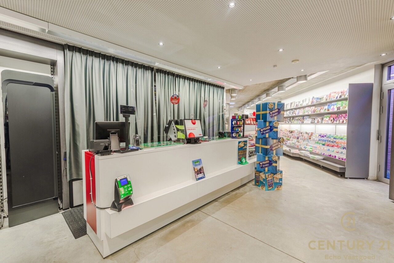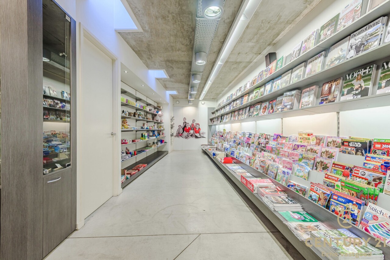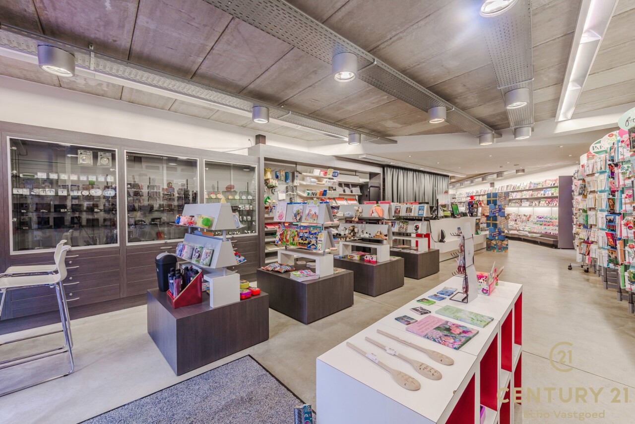 Op het gelijkvloers bevindt zich de handelsruimte, momenteel ingericht als dagbladhandel, maar perfect geschikt voor diverse commerciële activiteiten. De winkel beschikt over een vooringang langs de straatzijde, wat zorgt voor een vlotte en professionele toegang voor klanten, en een interne verbinding naar de woning.