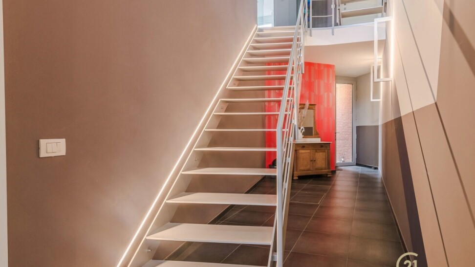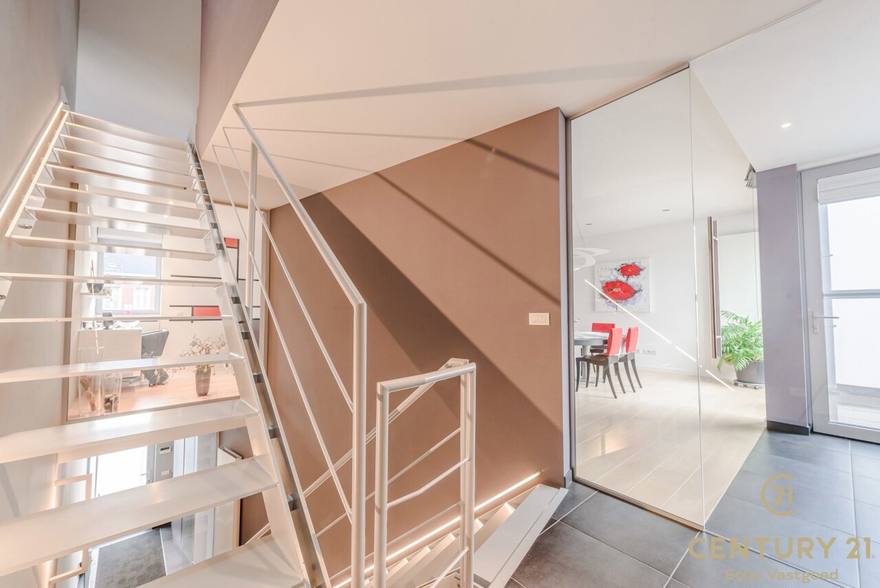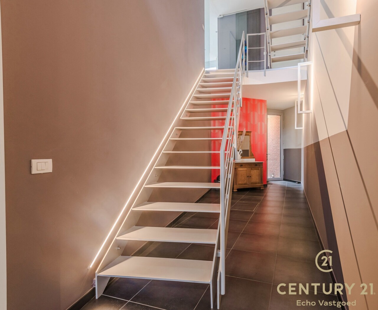 De woonst is bereikbaar via een eigen toegangsdeur en komt uit in de inkomhal met trap. Vanuit deze inkomhal heeft u eveneens toegang tot de fraaie tuin.