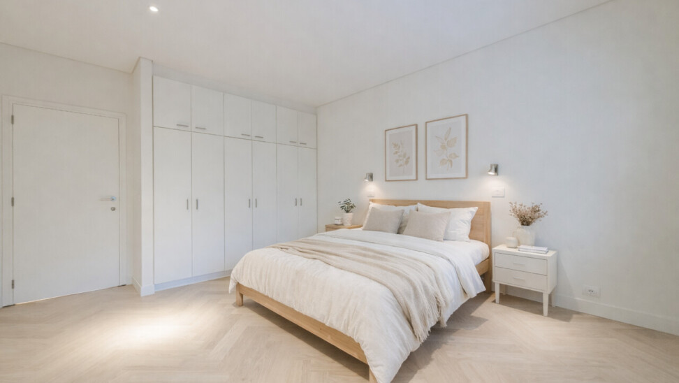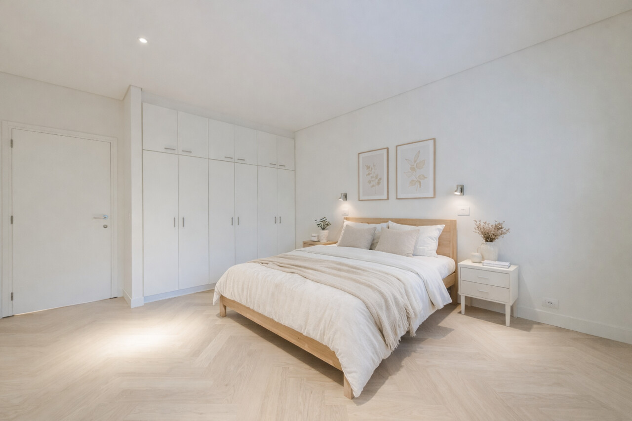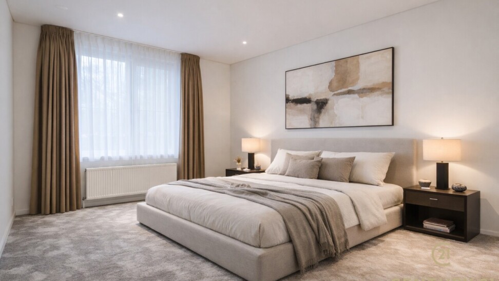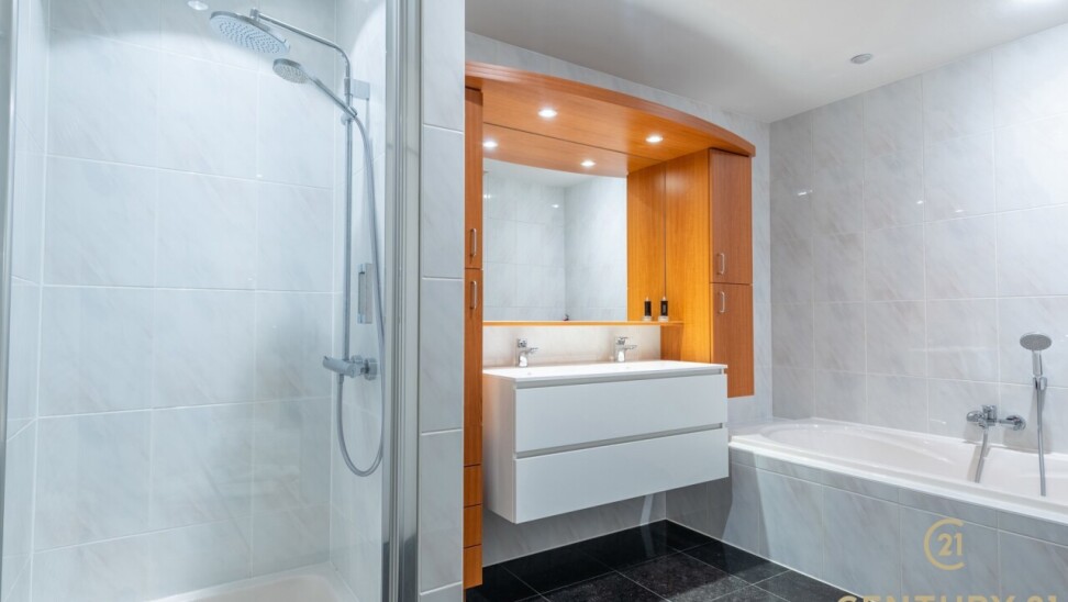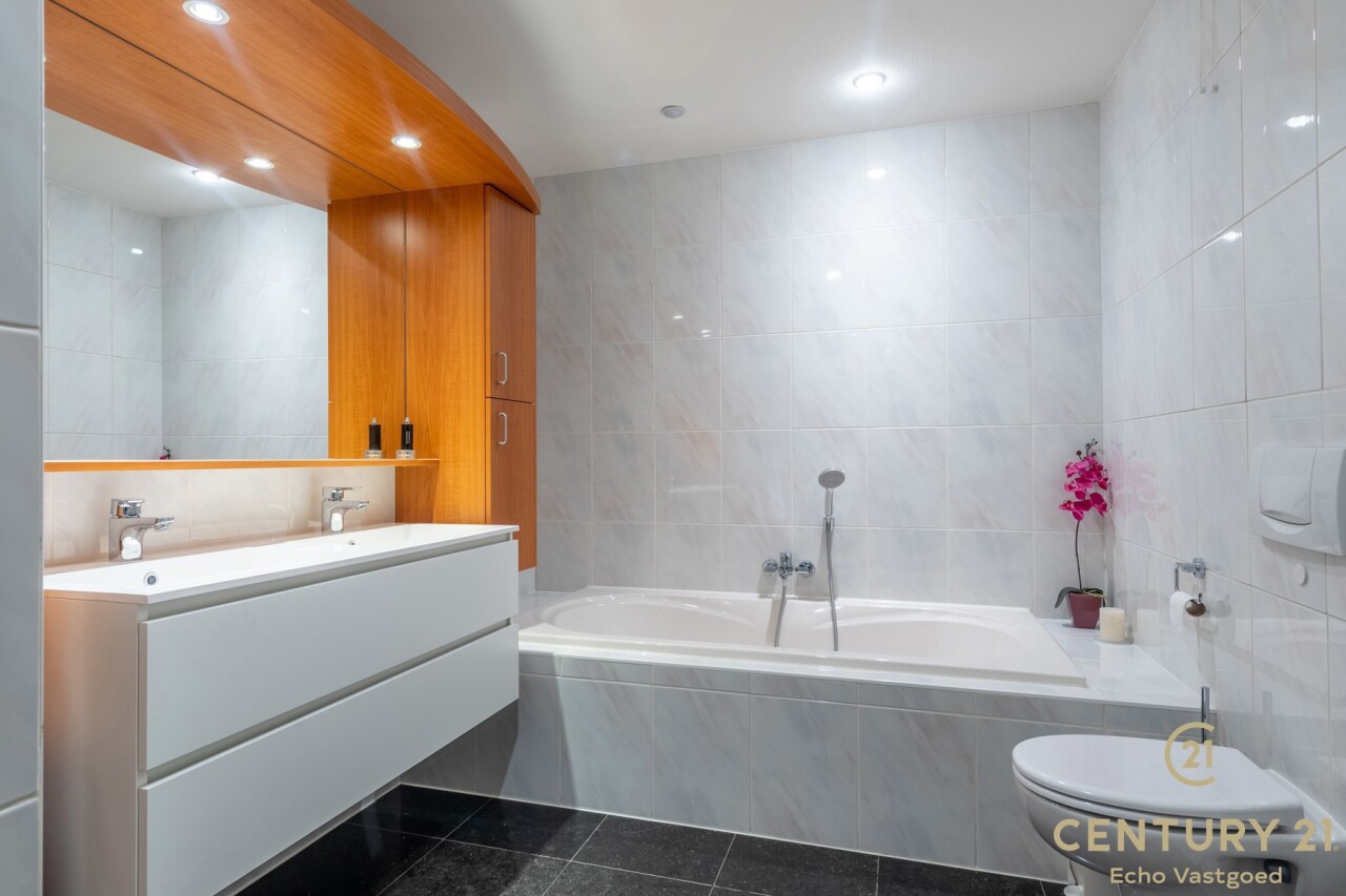 Het appartement beschikt over drie volwaardige slaapkamers, waarvan twee met praktische ingemaakte kasten. De master bedroom heeft directe toegang tot de luxueuze badkamer, uitgerust met een ligbad, inloopdouche en dubbele wastafel.