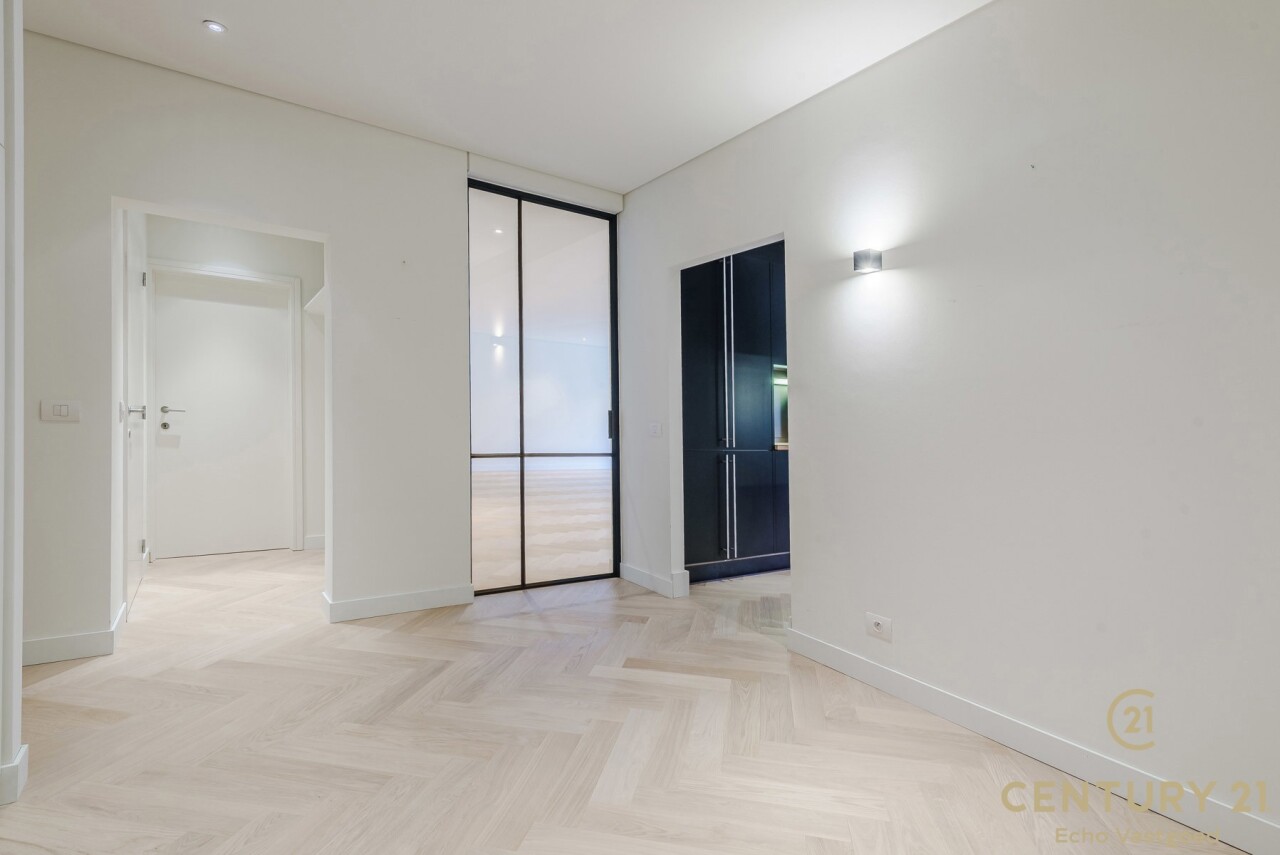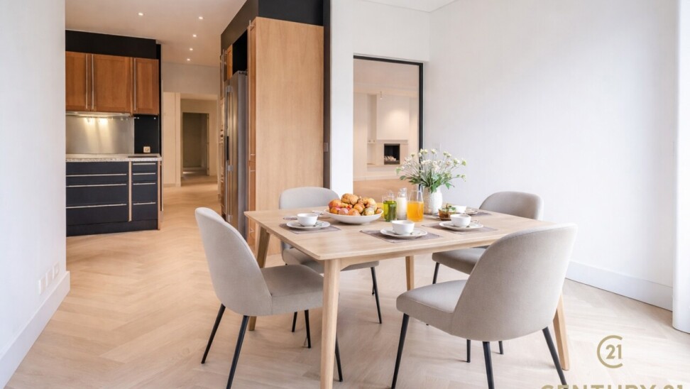 De inkomhal met vestiaire en gastentoilet vormt een elegante entree. De ruime, open leefruimte sluit naadloos aan op de eetkamer en de volledig ingerichte, moderne keuken – een uitnodigende plek voor zowel intieme diners als het ontvangen van gasten. In 2026 werd het appartement bovendien stijlvol geüpdatet met massief eiken visgraatparket, wat zorgt voor een warme en tijdloze uitstraling, en werden er elegante staal-glasdeuren geplaatst tussen de woonkamer en de keuken, die licht en ruimte op een verfijnde manier met elkaar verbinden.