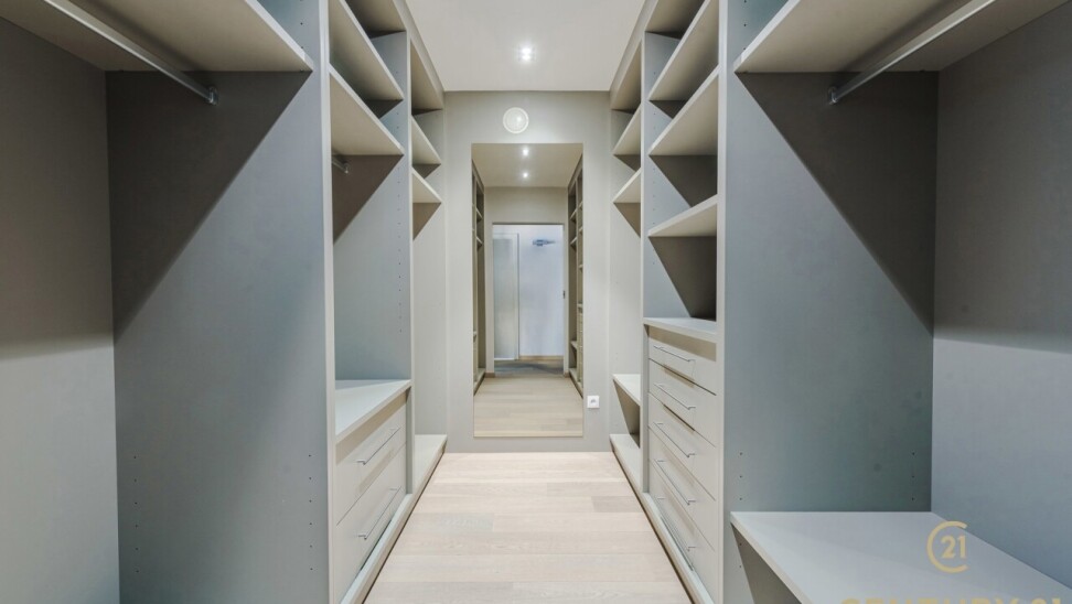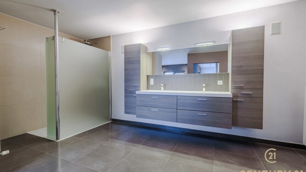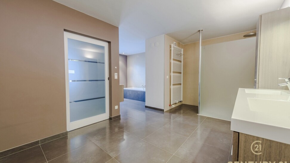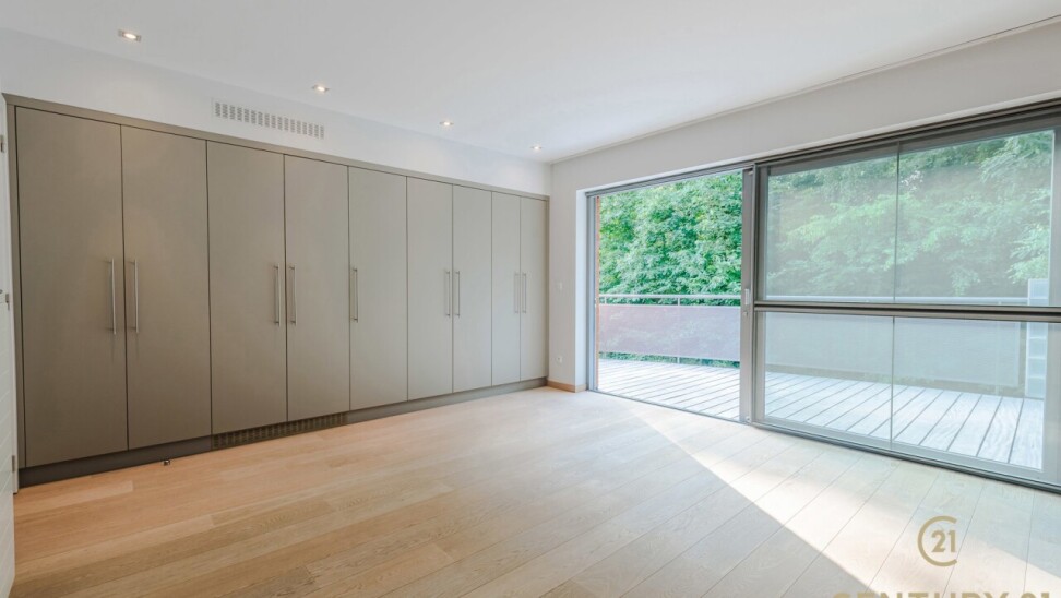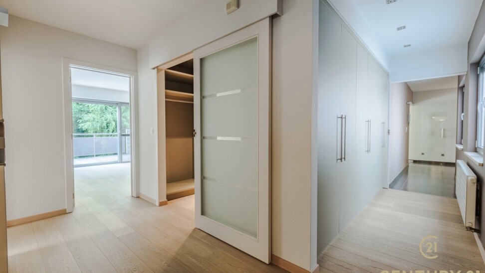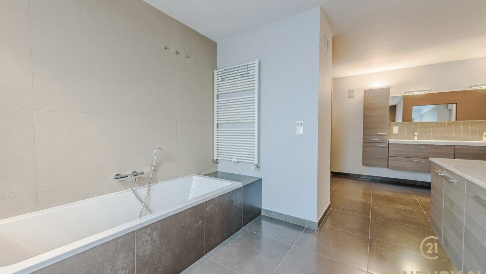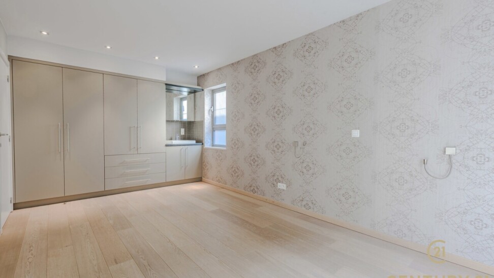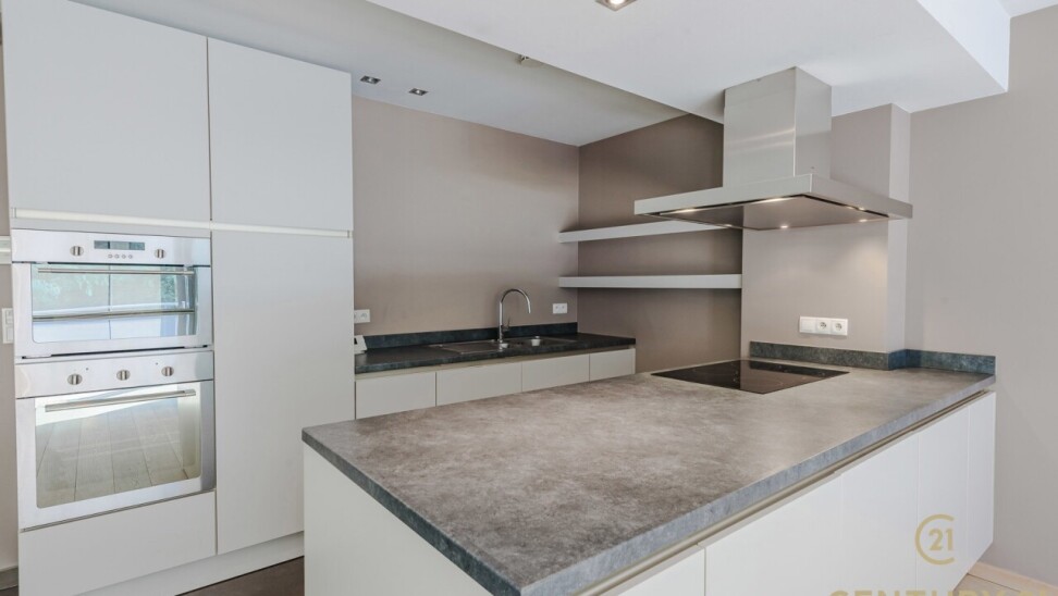 De open, volledig uitgeruste keuken beschikt over een stijlvol natuurstenen werkblad, veel kastruimte en direct contact met de leefruimte. De nachthal geeft toegang tot twee ruime slaapkamers met ingemaakte kasten, een luxueuze inloopdressing en een badkamer van formaat.