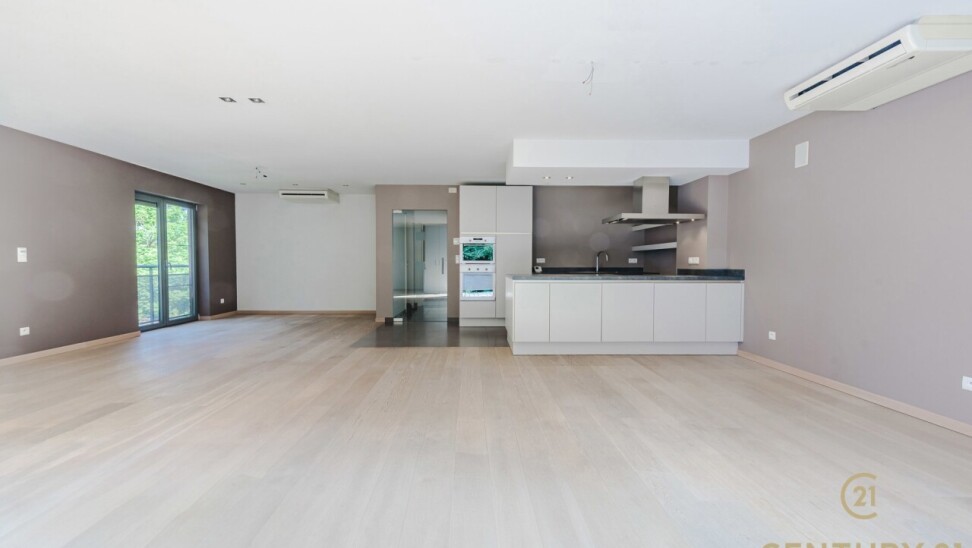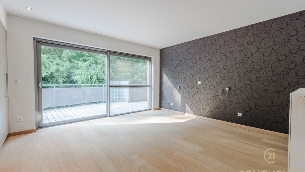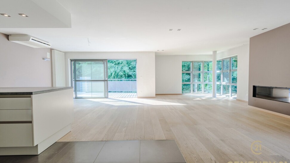 Bij binnenkomst valt meteen de royale indeling op. Het penthouse werd bij de bouw samengevoegd uit twee appartementen, waardoor u geniet van een bijzonder ruim woonoppervlak. De inkomhal met gastentoilet en praktische wasruimte met aansluiting voor was- en droogmachine leidt naar de sfeervolle woonkamer op eiken parket. Grote raampartijen zorgen voor een overvloed aan daglicht en bieden een prachtig uitzicht op het groen. De haardpartij voegt een warme toets toe, terwijl de schuiframen toegang geven tot het ruime zonneterras (30m2) — perfect voor lange zomeravonden.