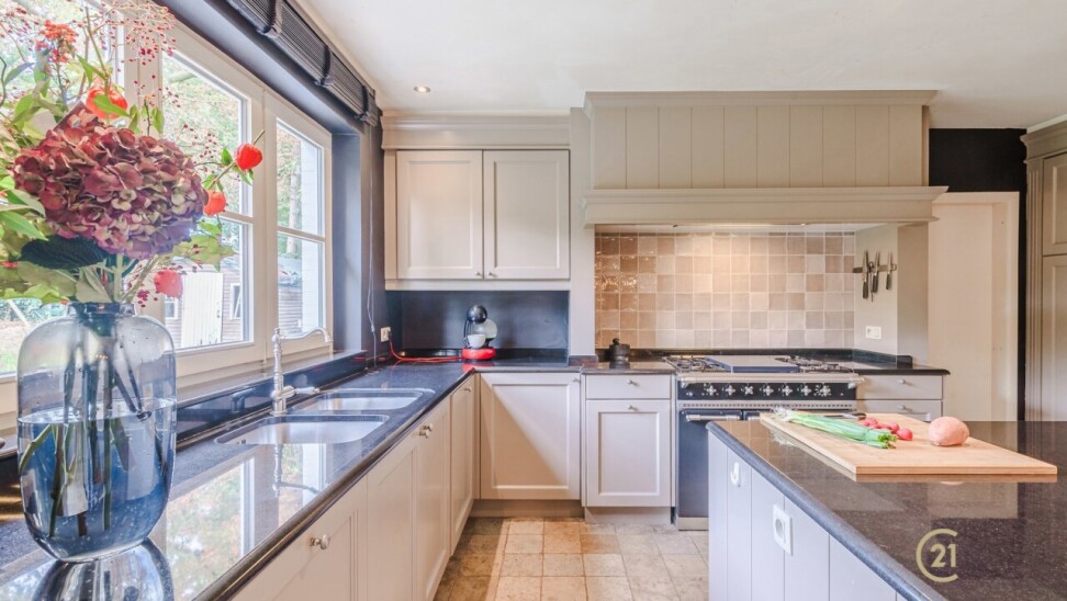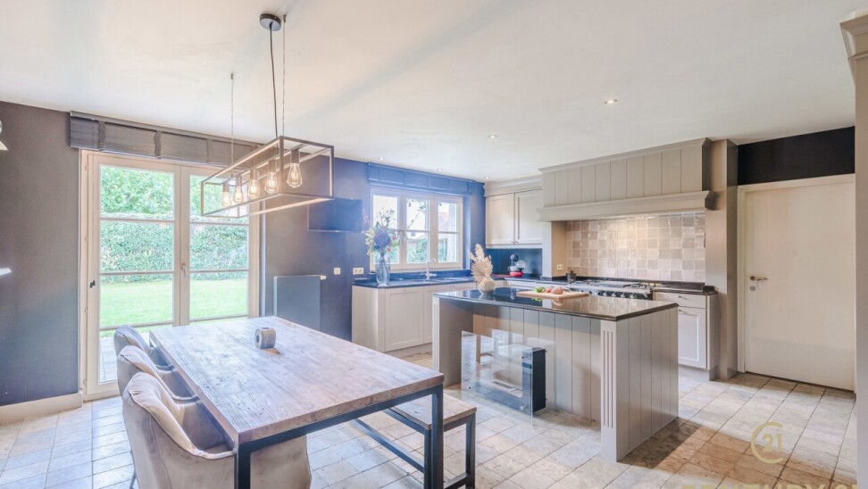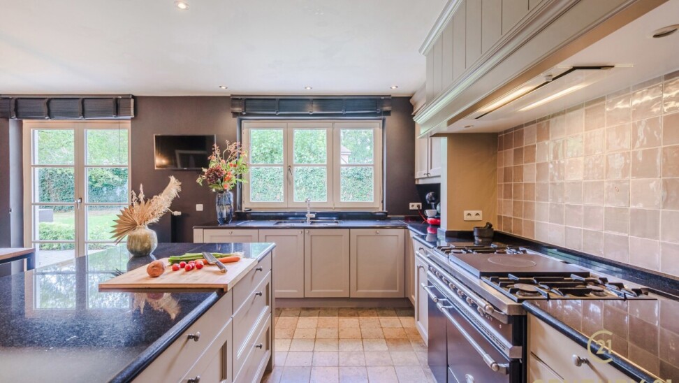 De gezellige woonkamer is afgewerkt met een eiken parketvloer en heeft een sfeervolle open haard als blikvanger. Grote raampartijen zorgen voor een overvloed aan daglicht. Aansluitend bevindt zich de royale leefkeuken – een waar paradijs voor de hobbykok – uitgerust met een Lacanche-gasfornuis en topkwaliteit Miele-toestellen, waaronder een hogedrukstoomoven, combi-oven, ingebouwde koelkast en vaatwasser.